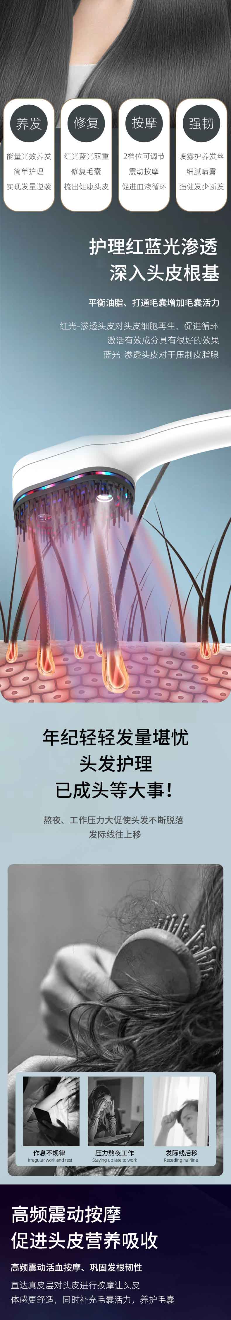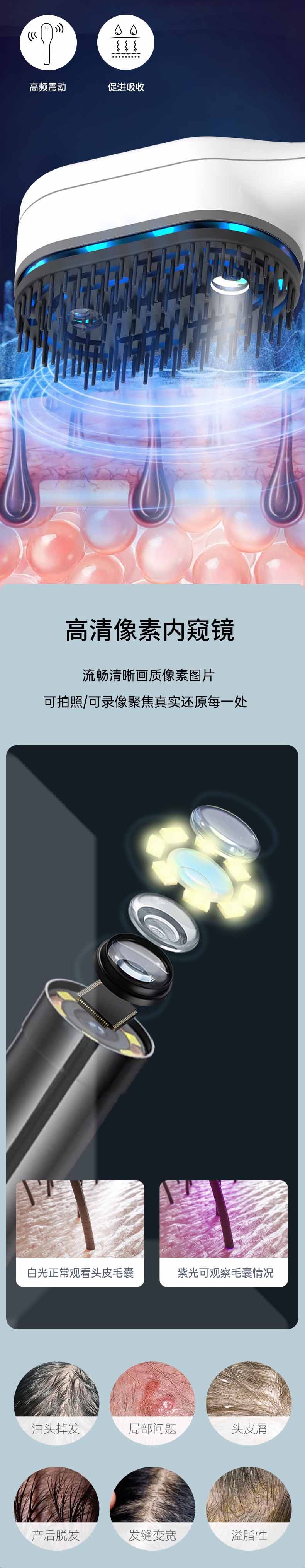 Upgraded version of visual electric massage comb to prevent hair loss, with red, blue, purple and purple light applied for medication and hair growth, hair care and scalp combing